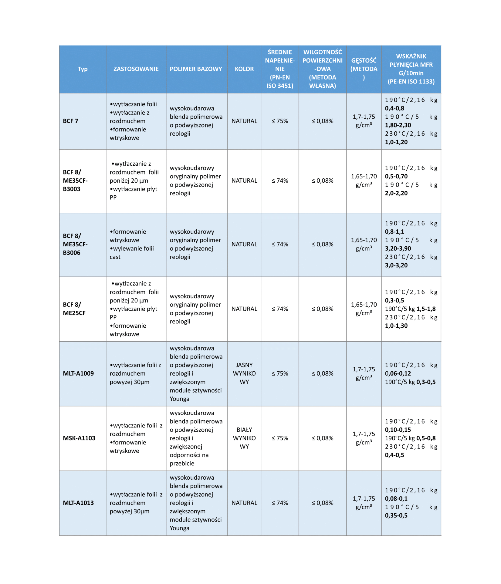 Różne odmiany przeznaczone do wytłaczania folii, zapewniające dobrą obróbkę, stabilny proces i odpowiednie właściwości mechaniczne.